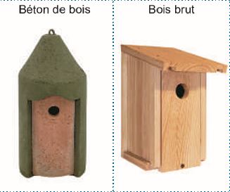 El roble o el álamo también son muy adecuados, ya que son muy resistentes a la humedad. El grosor debe ser suficiente, para garantizar una construcción fácil, pero también un buen aislamiento: 1,8 cm mínimo para modelos pequeños y 2,5 cm para modelos grandes. La madera sin planchar es preferible, especialmente en interiores ,ya que permite que los polluelos se aferres para llegar al agujero de vuelo cuando llegue el momento. Si la madera es lisa en el interior, se puede dibujar ranuras horizontales o colocar una pequeña regla de madera cerca del orificio de vuelo. Si desea extender la vida útil de las cajas nido, el único tratamiento recomendado es la aplicación de aceite de linaza que se aplicará solo a las partes externas. Aparte de estas cajas nido para construir, también es posible utilizar cajas nido de madera u hormigón, disponibles de diferentes proveedores. como la tienda LPO, la empresa Schwegler o los centros de jardinería locales.
