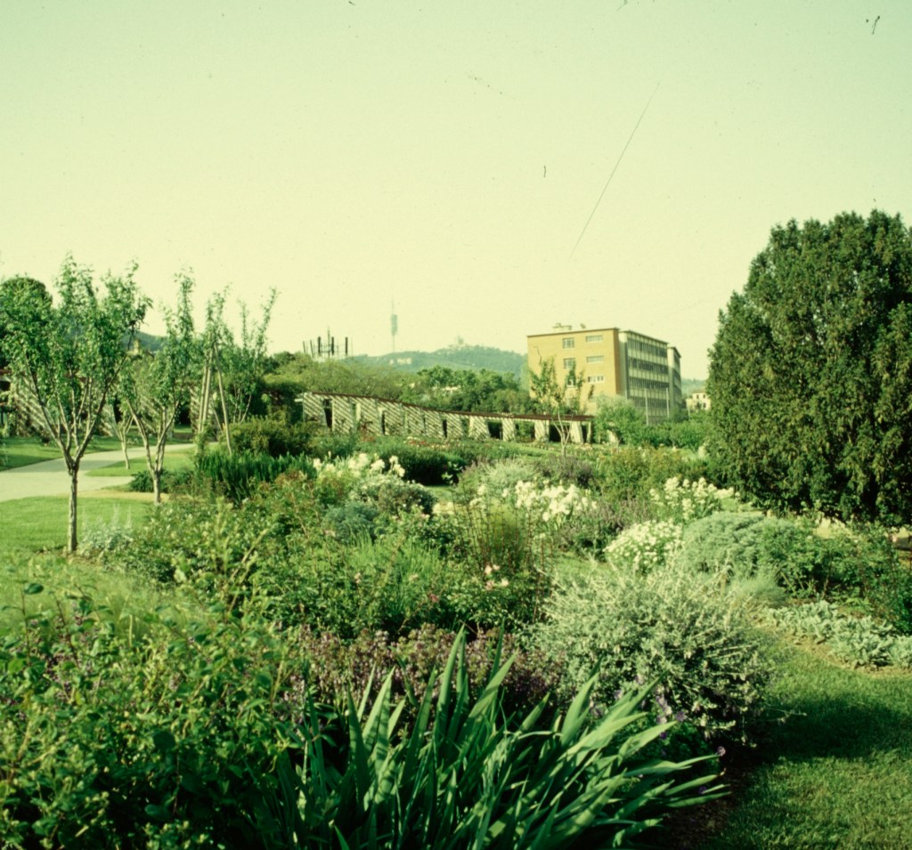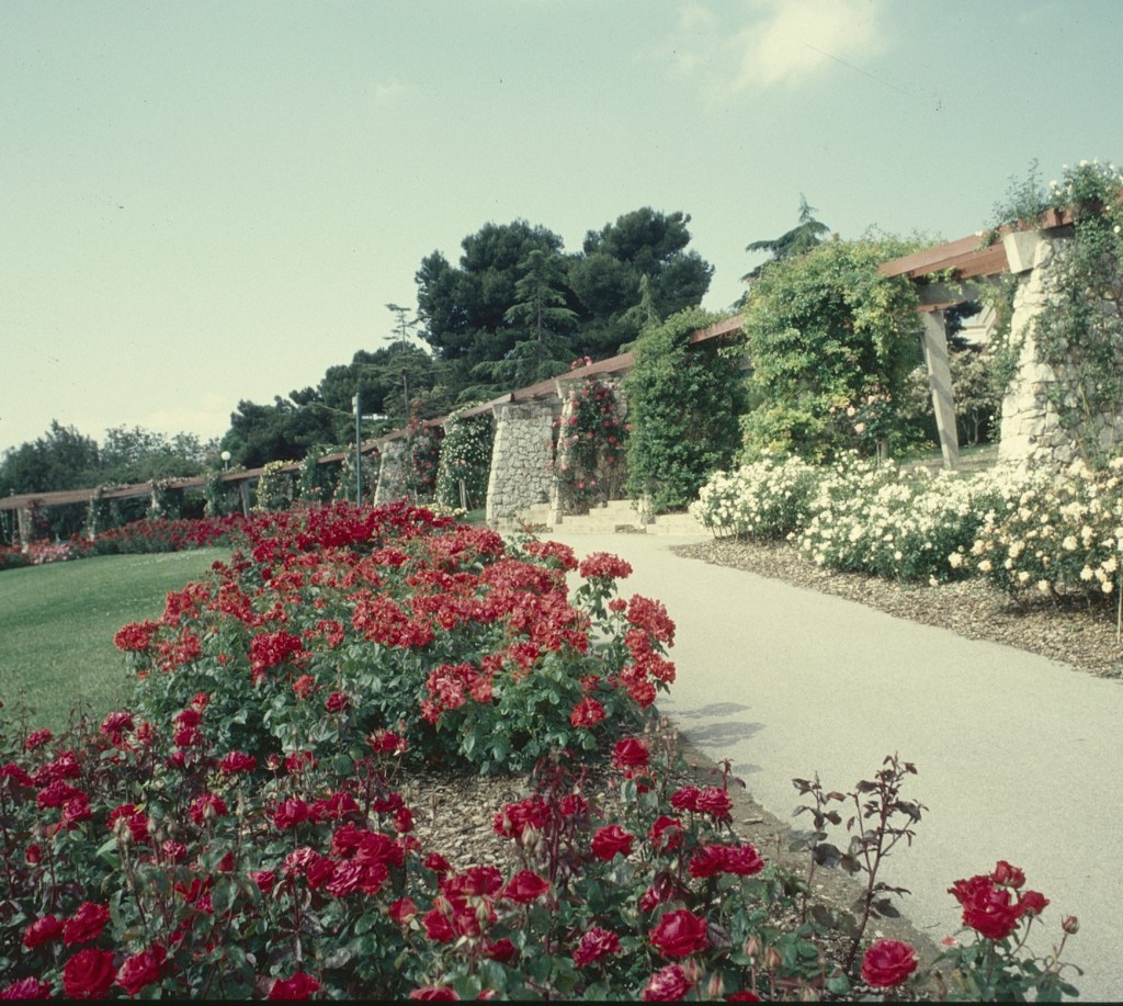 Si empezamos la visita desde la ronda de Dalt, lo primero que encontramos es una gran pérgola semicircular repleta de rosales trepadores de 233 variedades diferentes. Este es un lugar sombreado, con bancos para sentarse y contemplar no solo la rosaleda, sino también las vistas magníficas de Barcelona.