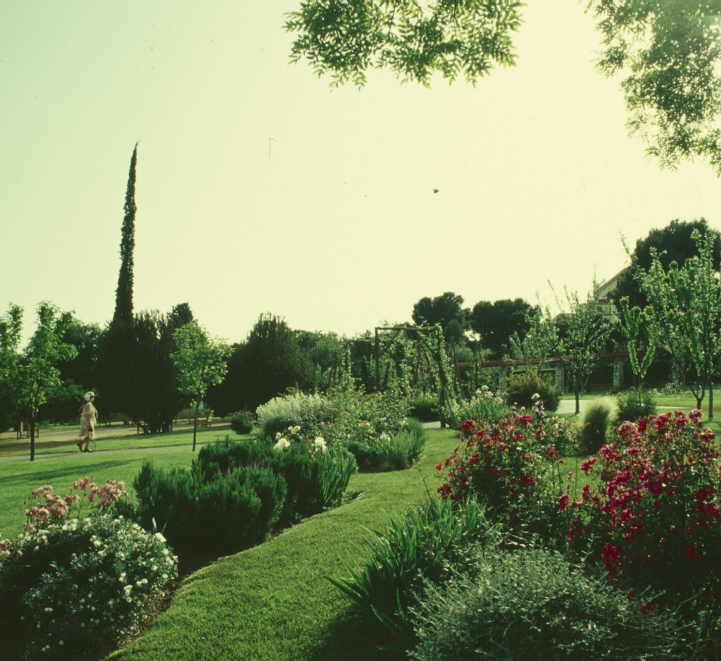 Los parterres de la rosaleda de Cervantes están ordenados, rodeados con un césped carnoso que personaliza los rosales y facilita el acercamiento. Pequeños arcos de troncos adornados con rosales trepadores nos invitan a entrar y, de una forma muy sutil, nos indican que en este jardín el paseo no se tiene que dar solamente por los caminos de sablón —que también los hay, delicados y muy bien delimitados—, sino sobre todo por los caminos de césped, que son los que nos permiten intimar con las rosas.