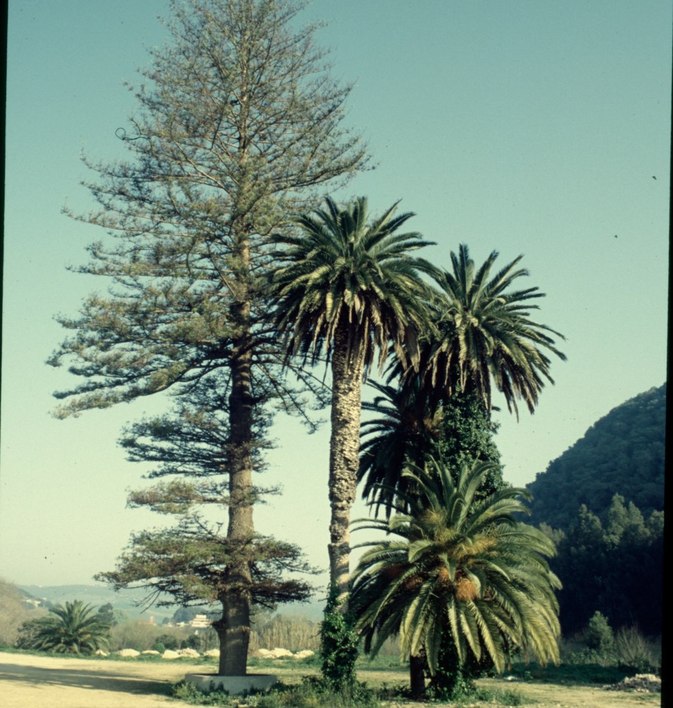 Digitalizando aquellas fotografías que en diapositivas guardábamos sin saber cuál sería su destino final, olvidadas en los archivos fotográficos se me apareció del 1993 la de aquella Araucaria heteerophylla que lucía al lado de la carretera general en el cruce de Vejer de la Frontera desviación a Barbate de Franco en aquel entonces, y que fue asesinada por ignorancia, al rellenar el suelo en el que estaba plantada para acondicionar un aparcamiento de coches para los establecimientos de restauración de este cruce.. El árbol no soporto la asfixia de raíces producida por el relleno y se perdió un magnifico ejemplar que durante años fue el icono del lugar.