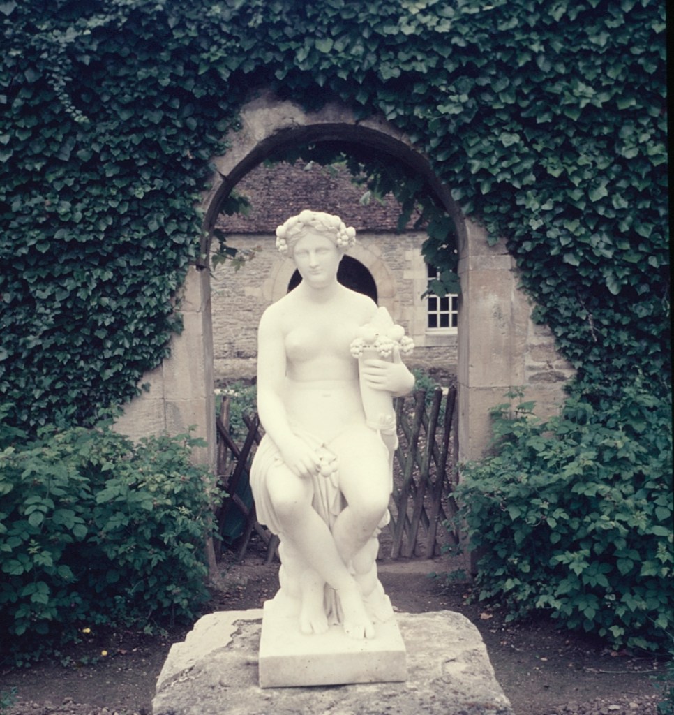 Domina la escena una estatua de Pomona enmarcada entre rosales.