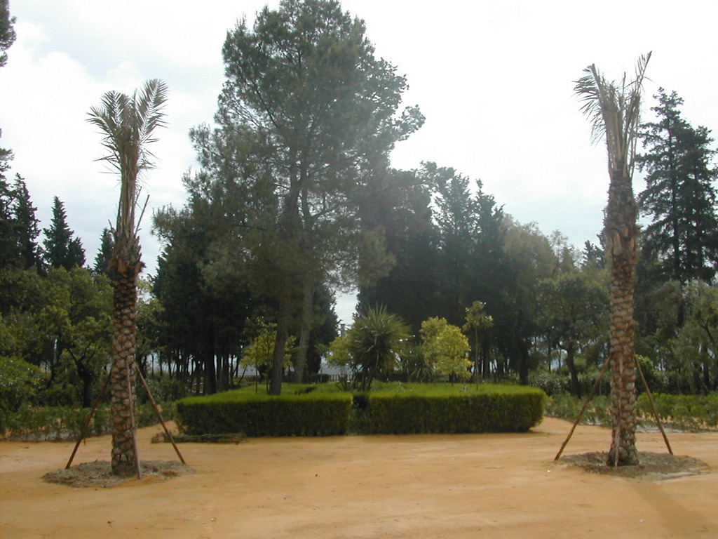 El eje central se encuentra flanqueando por dos zonas simétricas donde es posible comprobar la presencia de algunos arbusto y árboles limitados por setos de boj.-Buxus sempervirens.