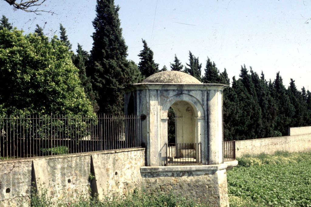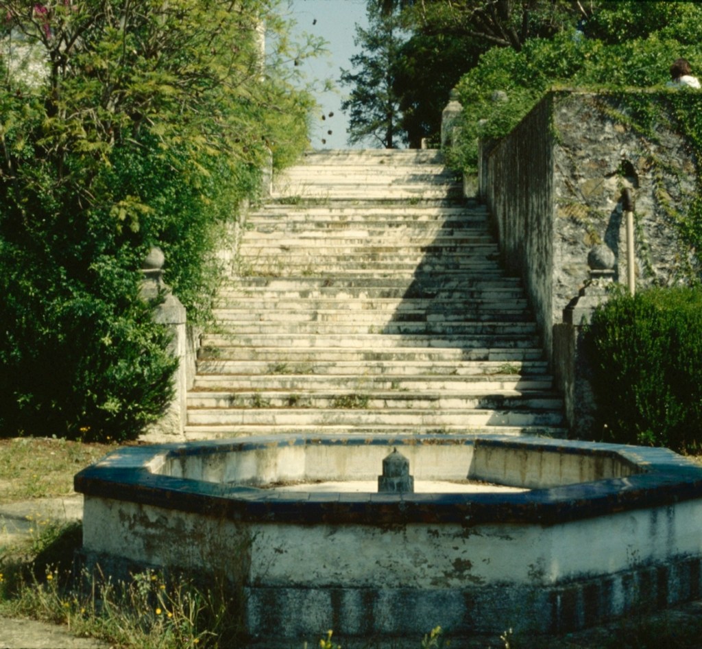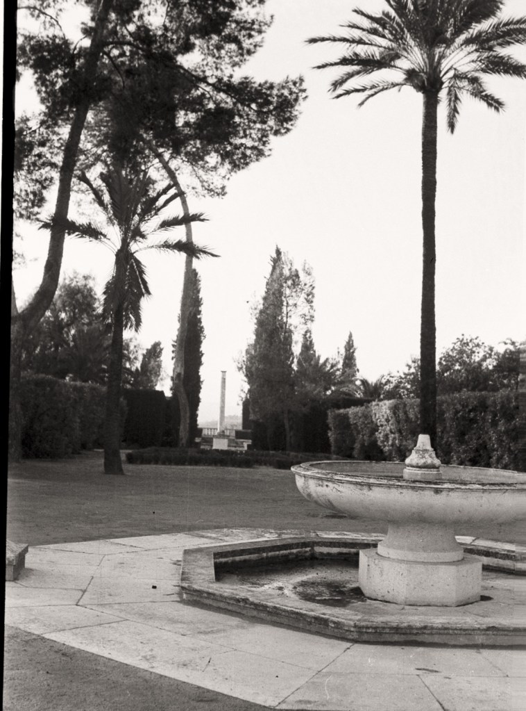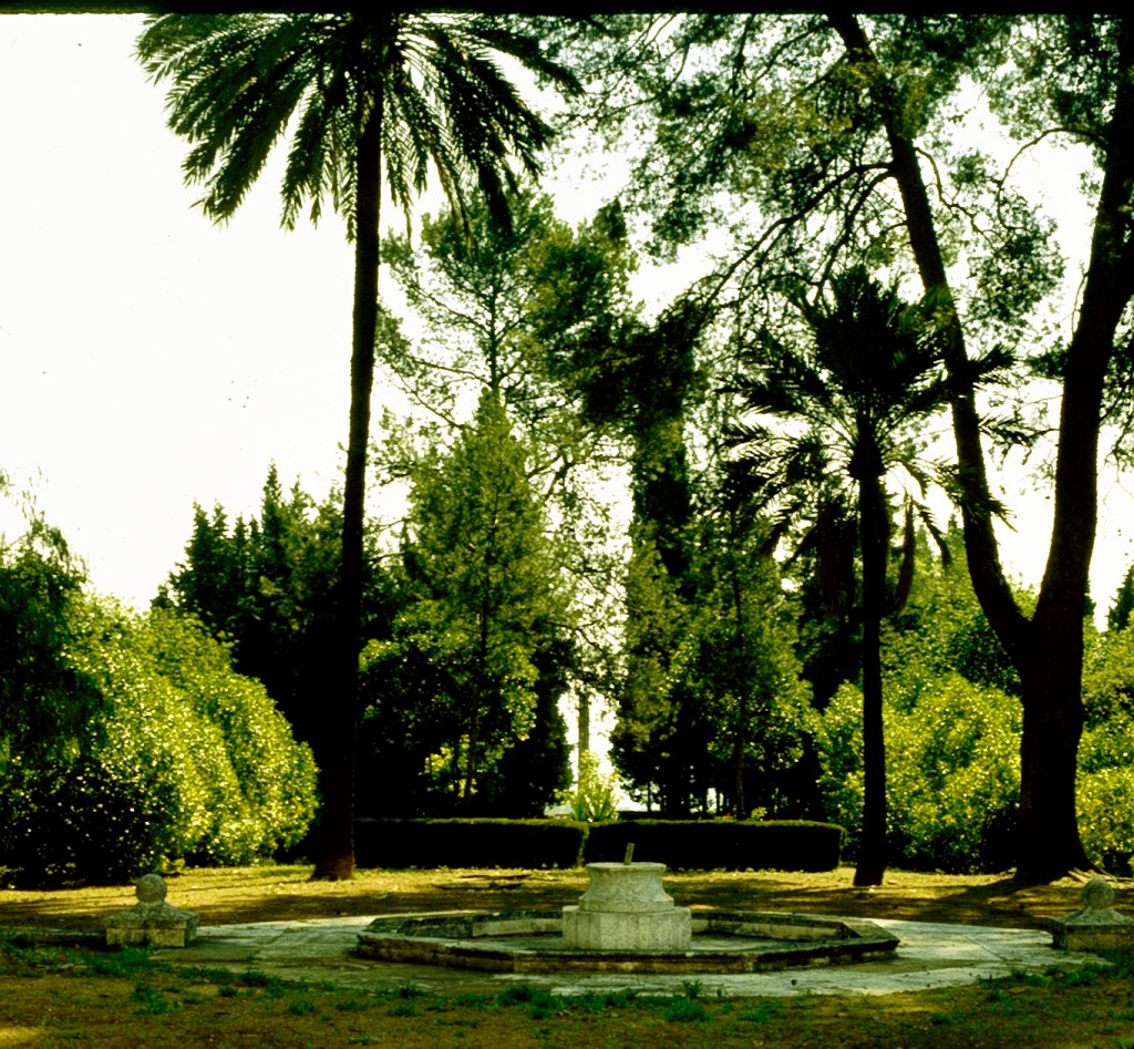 La “fuente de la vieja” conecta un sistema de canales de riego que surte de agua a un conjunto de parterres con setos de mirto.-Mirthus communis y alineación de Jacarandas.-Jacaranda mimosifolia.