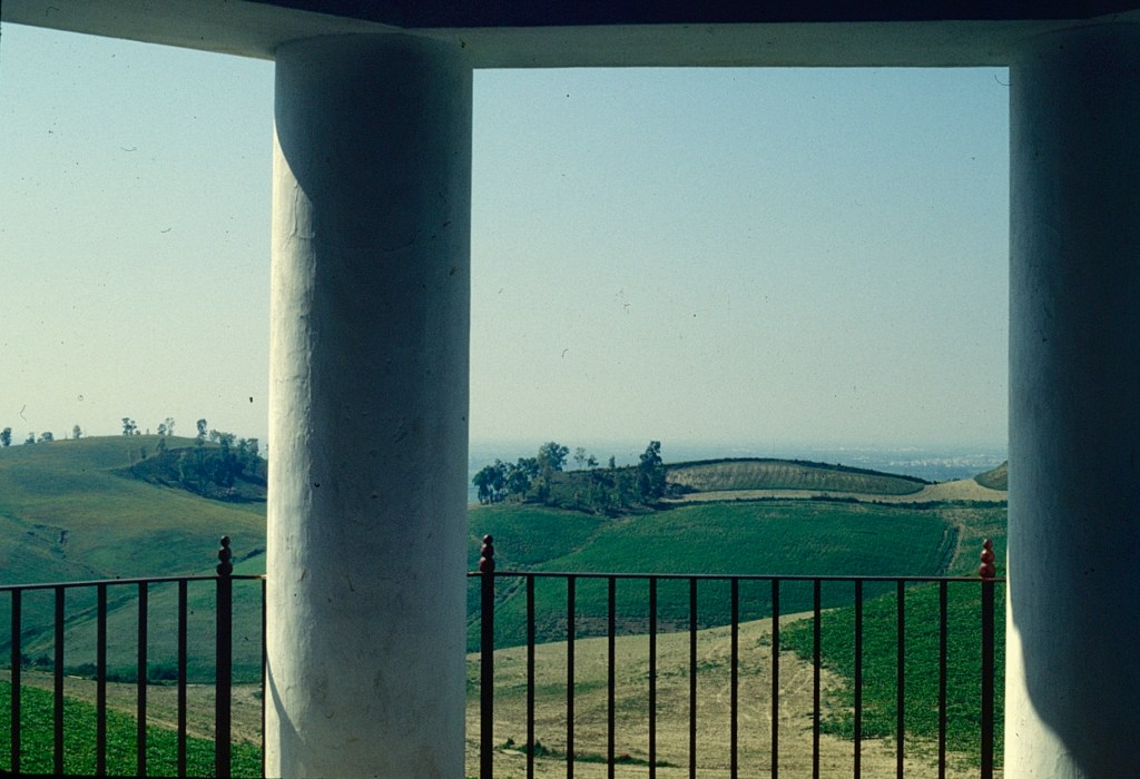 Una balaustrada limita el jardín elevado sobre el nivel de las tierras de cultivo.