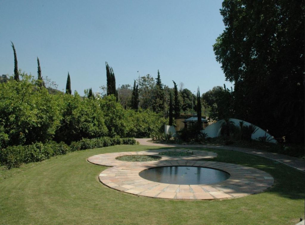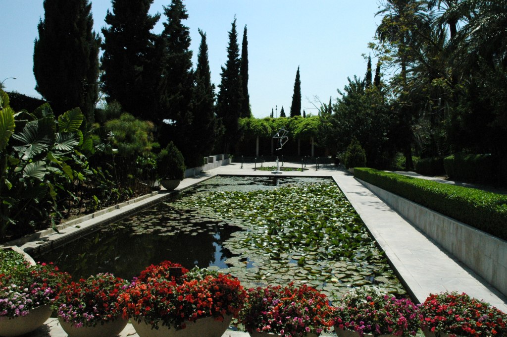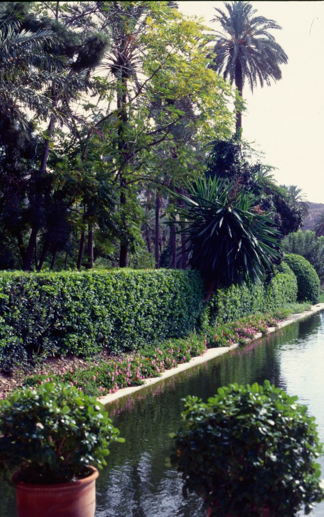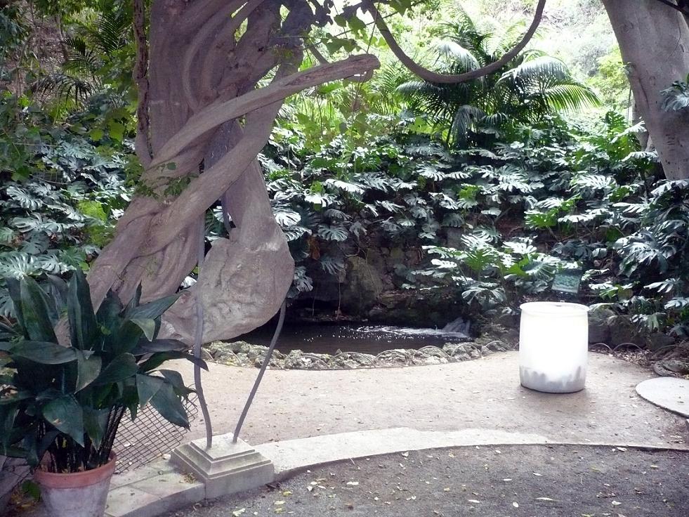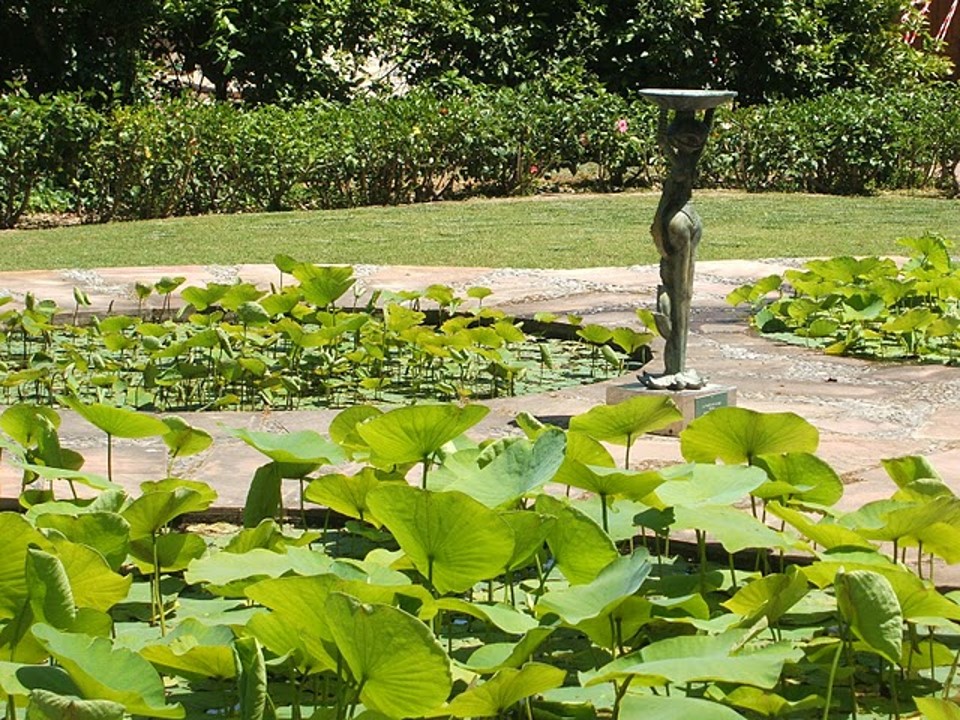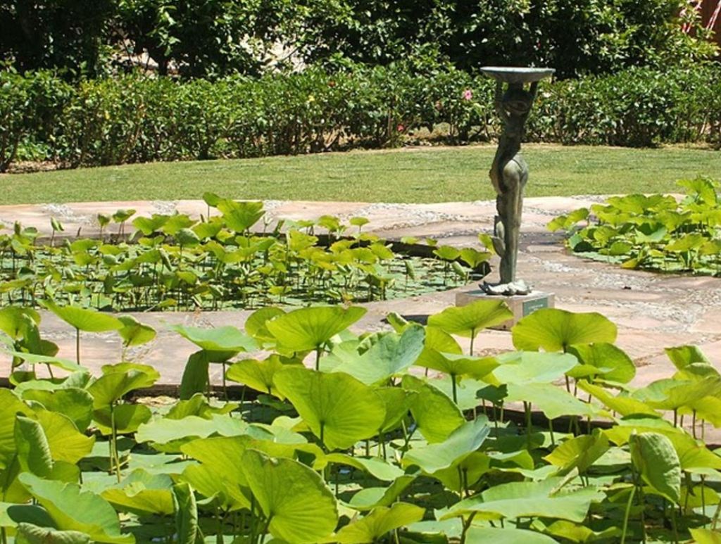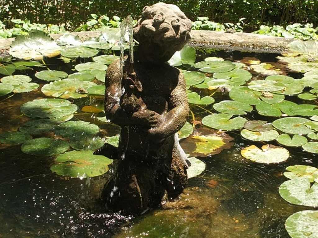 La ninfa nos introduce en una zona plantada al estilo francés, con setos cuidados y plantas centradas dentro de los setos. Aunque la tipología general del jardín histórico es a la inglesa, esta zona fue creada con el fin de poder disfrutar de ambos modelos de ajardinamiento dentro de La Concepción. A la espalda de la ninfa se puede apreciar una palmera azul mexicana .-Brahea glauca centenaria, uno de los ejemplares con mayor valor botánico, cuyas hojas parecen azules con determinados tipos de luz.