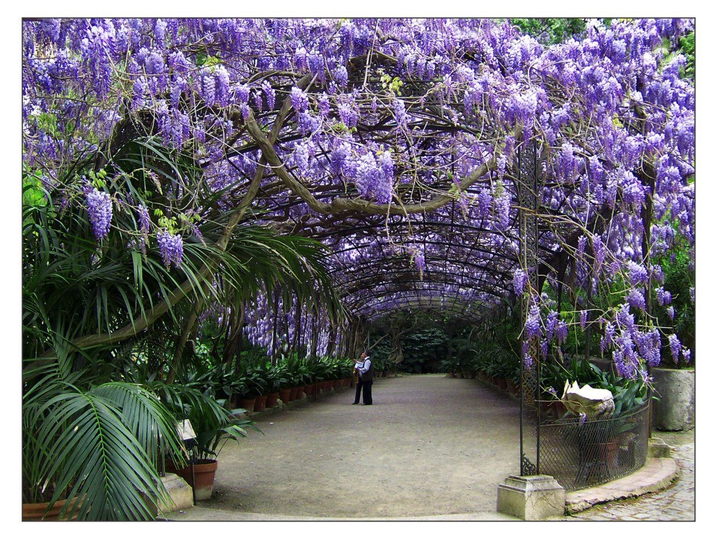 Las glicinias aparecen en uno de los lugares más bellos del Jardín de la Concepción, el cenador de hierro, lugar donde se celebran eventos, sobre todo en la época del año cuando se produce la floración.