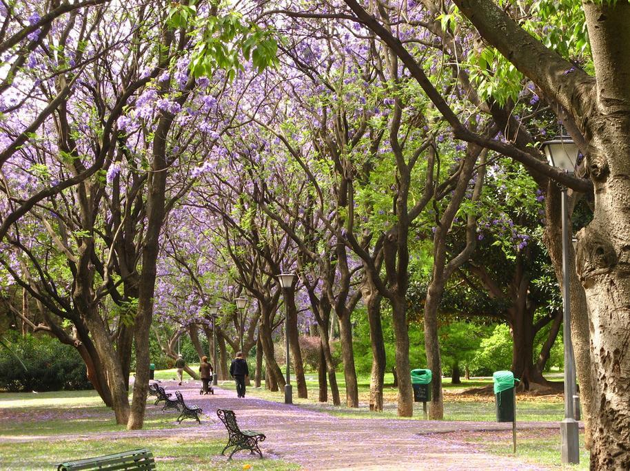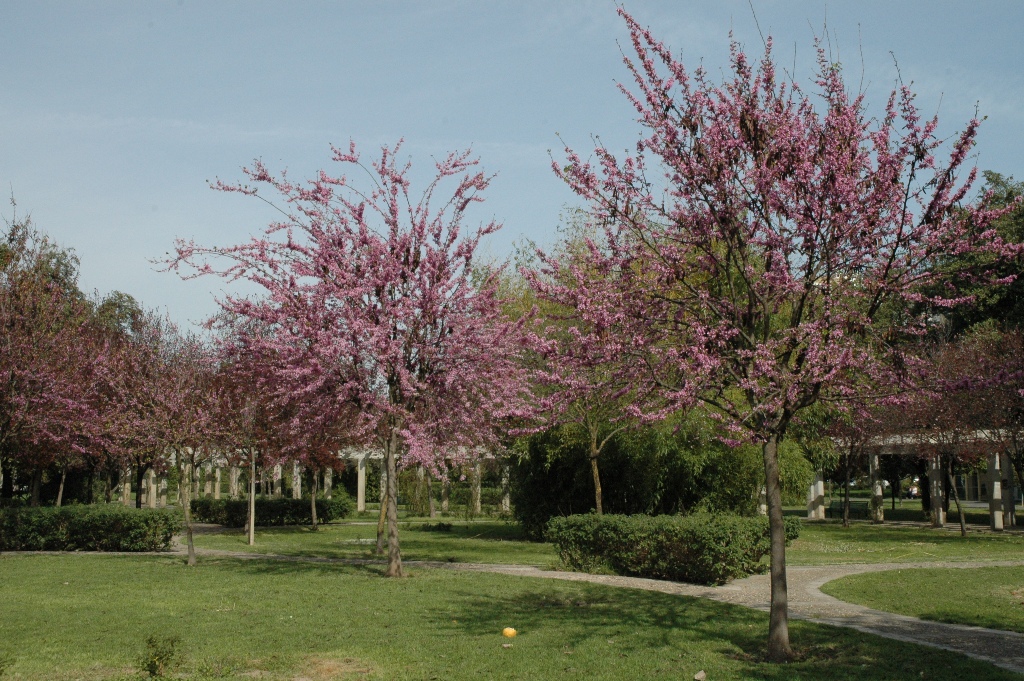 Las Jacarandas, Jacaranda mimosifolia alineadas al lado de los paseos ofrecen la preciada sombra y unos bellos momentos cuando florecen, un paseo con ciruelos japoneses.-.Prunus ceracifera var.pissardii ha dejado de existir, son arboles poco longevos, otro de los paseos está compuesto por doble fila de naranjos amargos.-Citrus aurantium var amara que desde su plantación presenta un aspecto esplendido con abundante floración en primavera y sombra en verano.