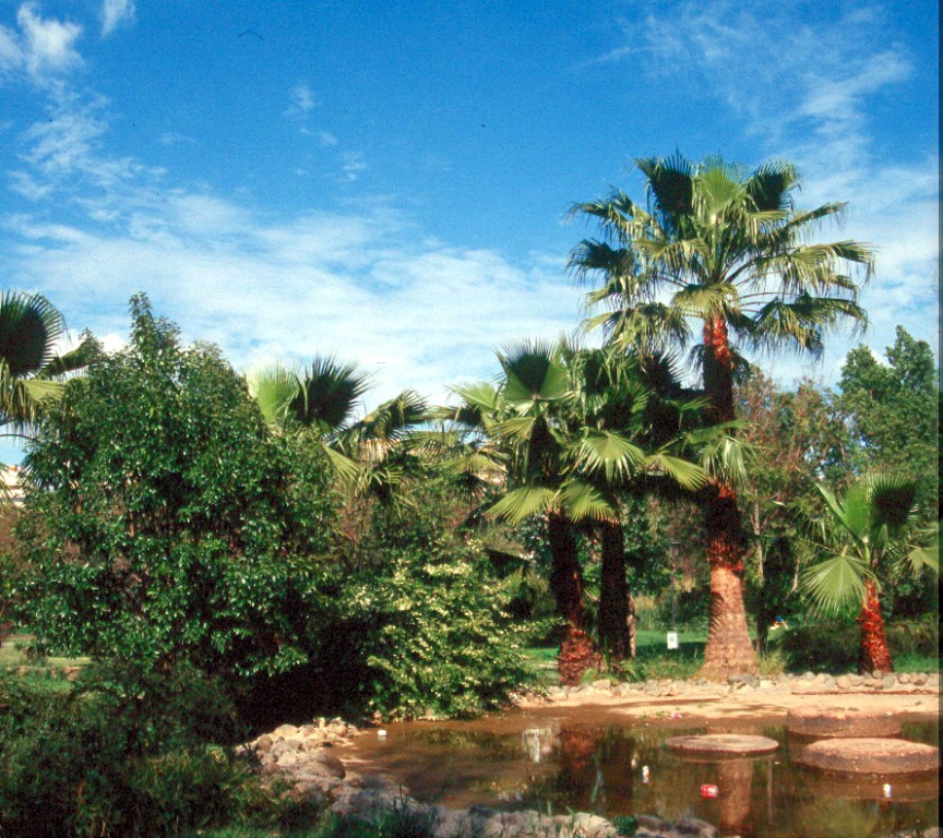 Destacariamos una araucaria .-.Araucaria heterophylla junto al estanque ,unas falsas pimientas Schinus mollis con sus ramas colgantes y un árbol de las orquídeas.-Bahuinia variegata.