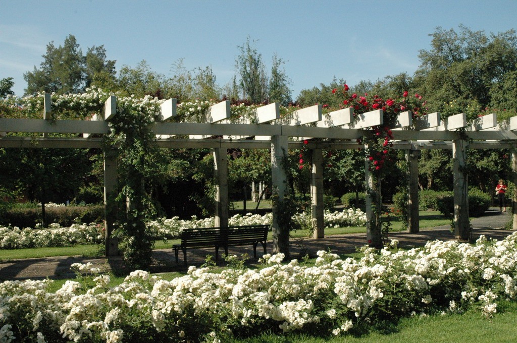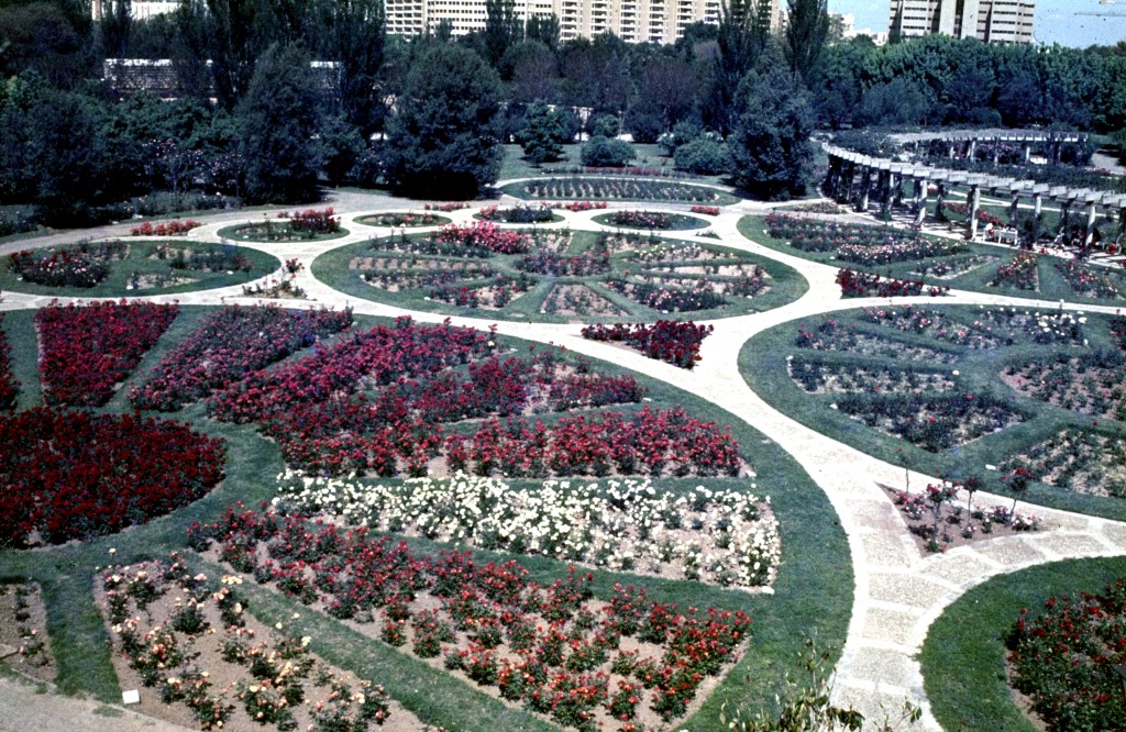 Una sucesión de círculos de diversos tamaños, tangentes entre sí, formados por paseos pavimentados con losas de cemento y chinas con fondo de césped, enmarcaban la polícroma colección de rosales, más de seis mil plantados en grupo, por variedades y colores.