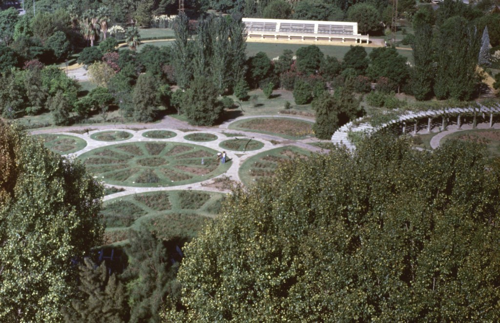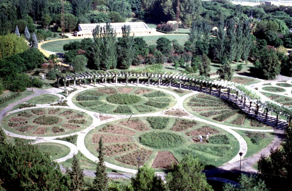 Con la superficie y disponibilidades económicas que se contaban, se ideó un trazado libre formado por dos grandes círculos tangentes, divididos en dos zonas perfectamente señaladas por una amplia pérgola de hormigón cubierta en sus pilares por rosales trepadores tradicionales, Alain, Pierre S. Dupont, Virgo, Mme. A. Meilland.
