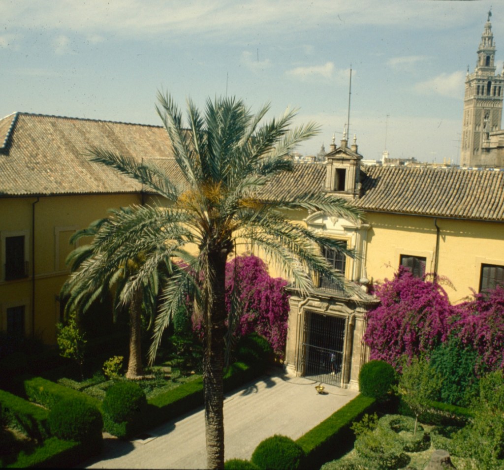 “ Desde comienzos de la Edad Moderna, la constante vinculación del Alcázar sevillano con la corona de España se constata en continuas transformaciones del edificio que intentaron acomodar su interior al gusto de los nuevos tiempos. Así, se reformó el piso alto del Patio de las Doncellas, que adquirió una fisonomía renacentista de gusto italiano. También se renovaron sus yeserías y se modificaron los arcos de la galería inferior. Igualmente, se construyeron a lo largo del siglo XVI espléndidos artesonados que aún mantenían la estética mudéjar y que no traicionan al primigenio espíritu del edificio; entre estos artesonados destacan especialmente el que cubre el amplio espacio del Salón de Embajadores.