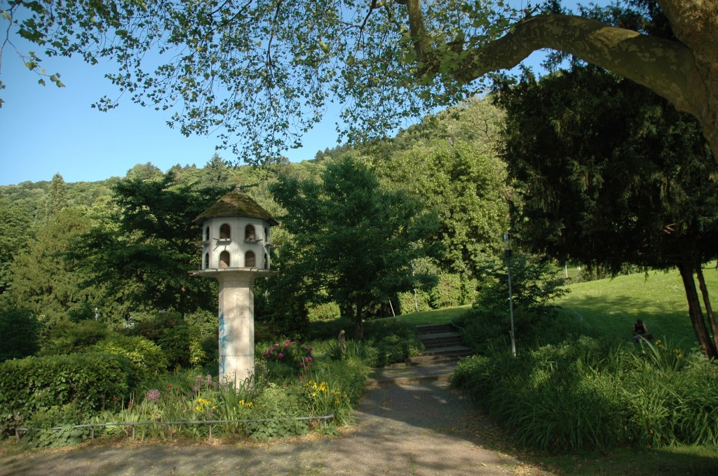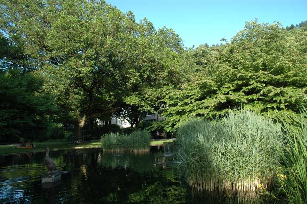 En uno de los estanques hay un monumento al dragón de Friburgo que, según la leyenda, advirtió a varias personas sobre el ataque aéreo en Friburgo. Aunque esto no está documentado históricamente y el historiador de la ciudad Peter Kalchthaler lo pone en duda, la cerámica del dragón fue encargada por el alcalde de Friburgo, Wolfgang Hoffmann, a Richard Bampi en 1953. En la década de 1980, el original fue reemplazado por una réplica pobre hecha de hormigón coloreado sobre una estructura de alambre. En marzo de 2020 se retiró para su restauración. Pero luego se decidió hacer una nueva copia del original, que se encuentra en el Museo de Historia de la Ciudad. El escultor David Steinbrück esculpió un nuevo dragón de piedra caliza resistente a las heladas sobre una copia de yeso.. El nuevo dragón se plantó a mediados de mayo de 2021.