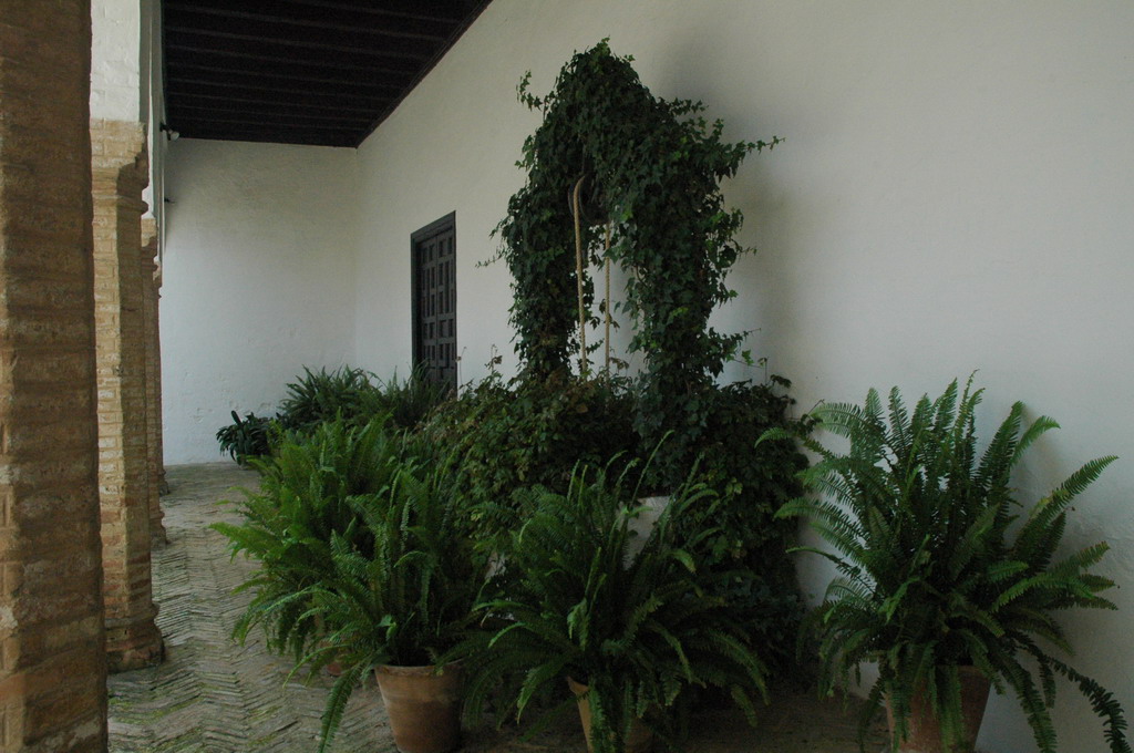 En el patio de entrada una magnifica pared de Bouganvillea glabra var. sanderiana que recortada a su tiempo ahora nos ofrece su magnifica floración y no faltan las plantas y helechos en maceta debajo de los arcos .