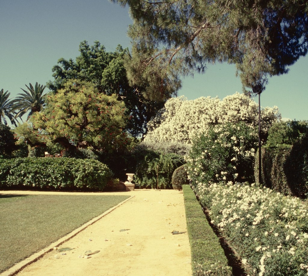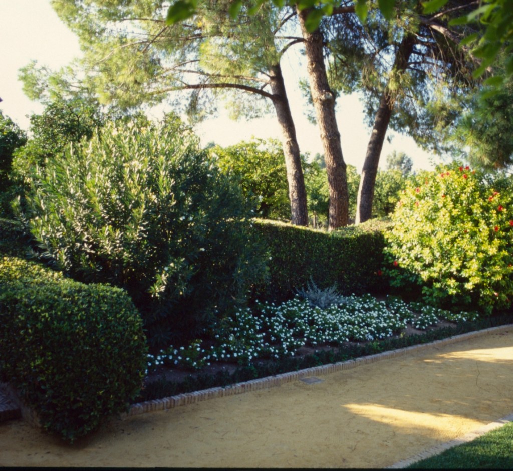 El jardín principal que se disfruta desde la casa esta compuesto por dos setos de laurel.-Laurus nobilis que lo limitan de la huerta colindante formando dos grandes parterres una a cada lado que han estado plantados de diversas especies durante el transcurso de los años con el fin de que conservaran durante el mayor tiempo posible las floraciones ,Para ello recibía consejos de su sobrina María Medina, paisajista. En las fotos aparecen plantados del rosal de flor blanca Iceberg.
