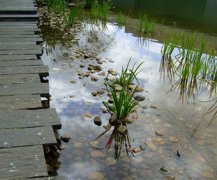 Se realizó una importante operación de limpieza y aclareo de la vegetación, abriendo nuevos caminos y áreas de fructificación en áreas antes inaccesibles. También se cerraron y formaron linderos con especies arbustivas como arrayán, boj y otras especies de la flora portuguesa utilizadas en este jardín desde su concepción inicial, muchas de las cuales incluso han sido reproducidas en los viveros de la Fundación, salvaguardando su herencia genética. La última fase en completarse fue la fase 4, con la pavimentación de senderos y la construcción de una pequeña estancia en la orilla sur del lago. Se trata de una zona de estancia en relación directa con el espejo de agua, donde se crea una situación excepcional para los dos tipos de ribera existentes en el lago. El banco corresponde al muro de sustentación que antes definía la orilla, y la superficie de cantos rodados, que establece la concordancia altimétrica con el fondo del lago, reemplaza el borde de vegetación lacustre que bordea todo el lago. Al final de esta larga intervención, “en la fuerza de su vegetación”, sorprendente y muy cómoda, el jardín se puebla en todos sus rincones, lleno de eventos programados y espontáneos, un lugar de pausa donde todos nos sentimos “en casa”. .