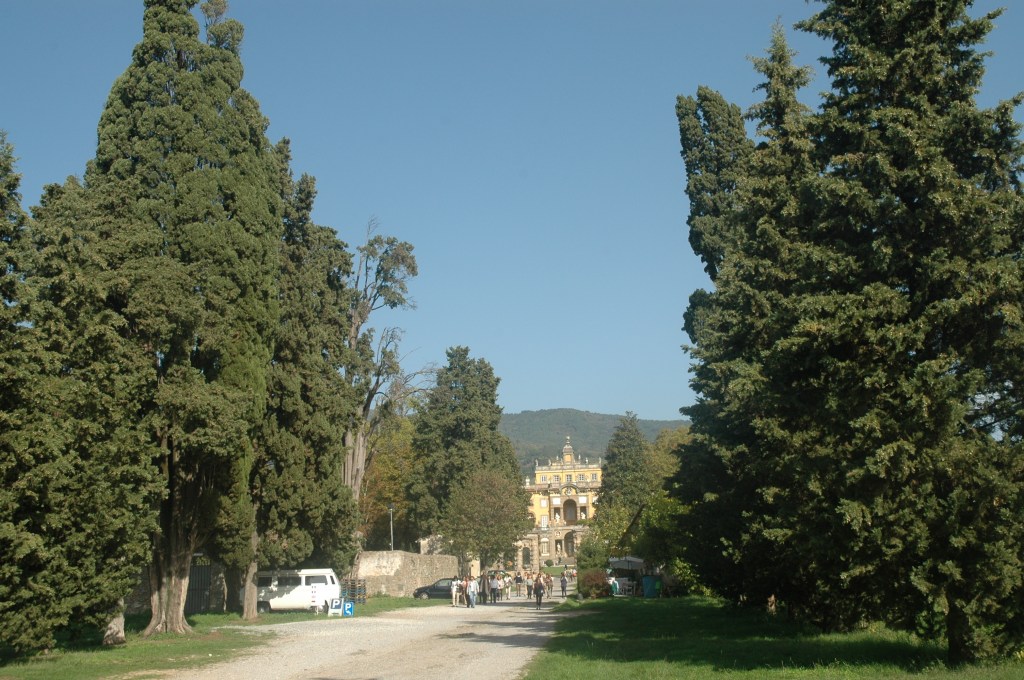 El eje principal de la villa se destaca por una hilera de magníficos cipreses, de aproximadamente 700 metros, que complementan la fachada de la villa. Al final de la avenida, cerca de una majestuosa puerta que entra en la casa, hay un pequeño pueblo, una vez destinado a los sirvientes