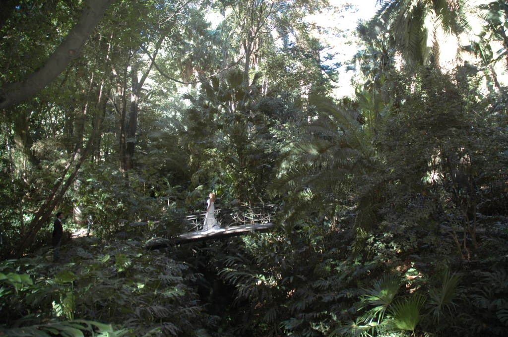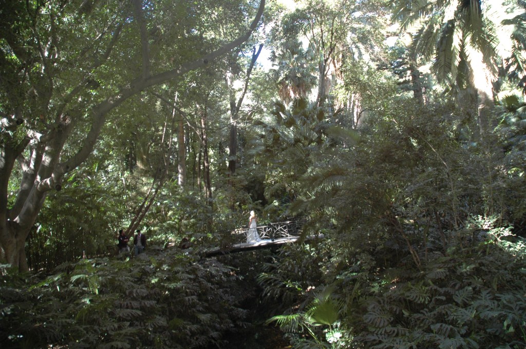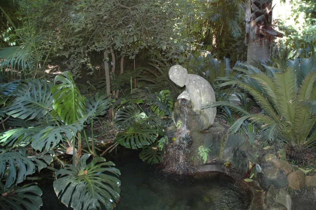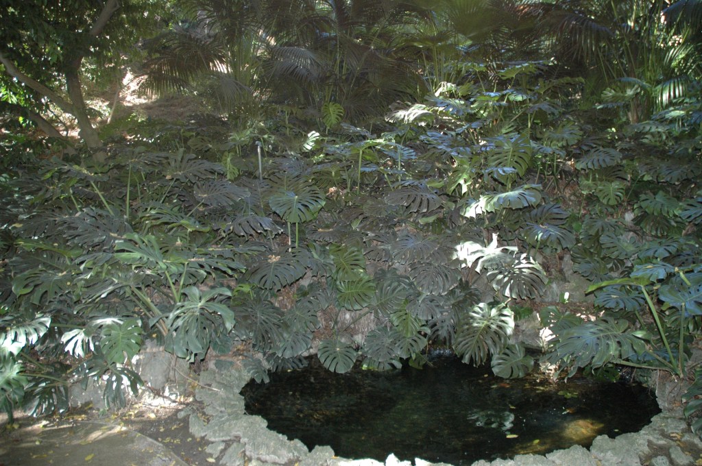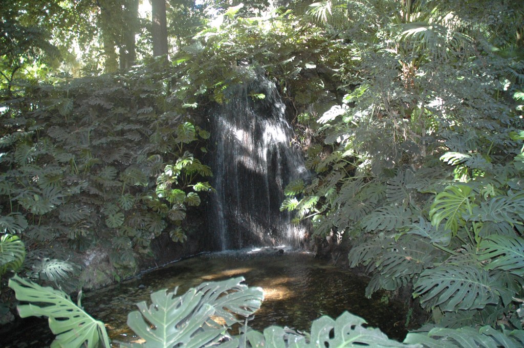 En mitad del jardín se puede ver una cascada de agua rodeada de enormes hojas de la planta Monstera deliciosa. La cascada fue construida hacia 1878 por Jorge Loring y dividió el jardín en dos partes mediante torrentes, rías, puentecitos, pasos de piedras, estanques y otras cascadas más pequeñas.