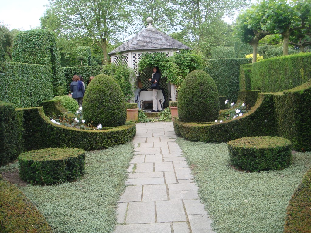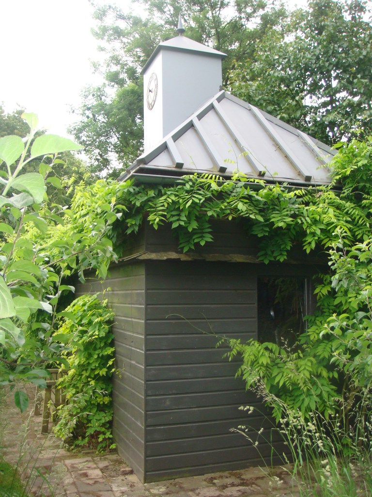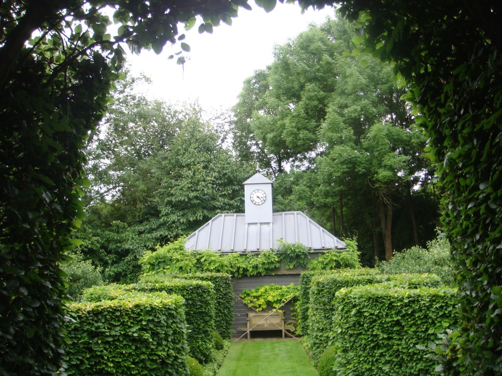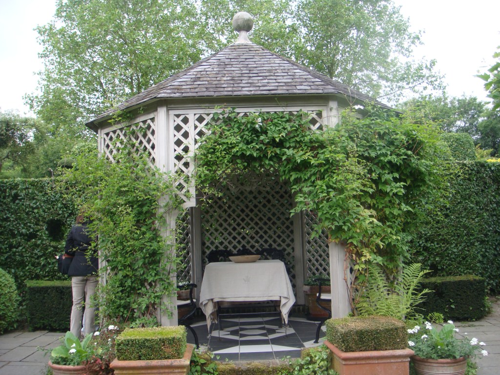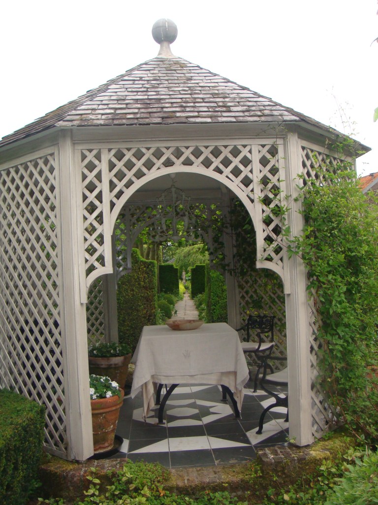 Después de los bordes y el jardín de rosas, pensó «que había quedado muy bien» y quedó muy satisfecha. Ella dice que estaba encantada con el regalo que recibió por su 50 cumpleaños, una hermosa glorieta de jardín. A Ineke se le permitió determinar la forma y el lugar: se hizo un paso en el seto que cerraba la rosaleda desde el huerto, creando un eje del que se colocó al final la glorieta. En los años siguientes, se construyó el jardín blanco alrededor del cenador, que se revisó a fondo varias veces hasta que se creó un jardín con bordes maravillosamente anchos y cuatro columnas de tejo como punto culminante.