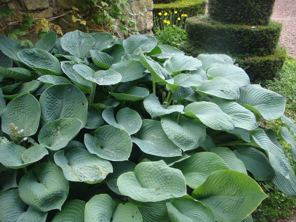 En el antiguo muro de piedra de Kunrader, los delfines echaban agua en cuencos con bordes de arenisca bordeados por bojes. Más tarde, la explanada se volvió cada vez más verde, por ejemplo, a través de tejo recortado y bloques con Hosta sieboldiana.