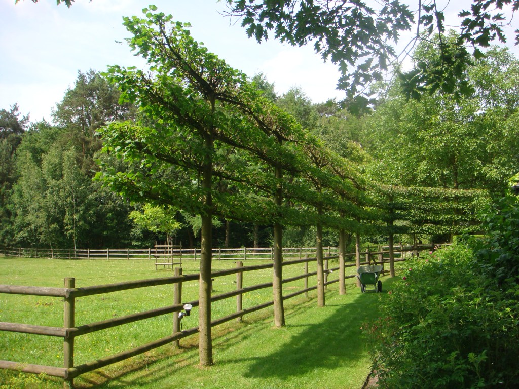 Pasando por detrás de la casa un camino de césped bordeado de árboles empalizados y de una maciza sombra nos conduce a la pradera de entrada.