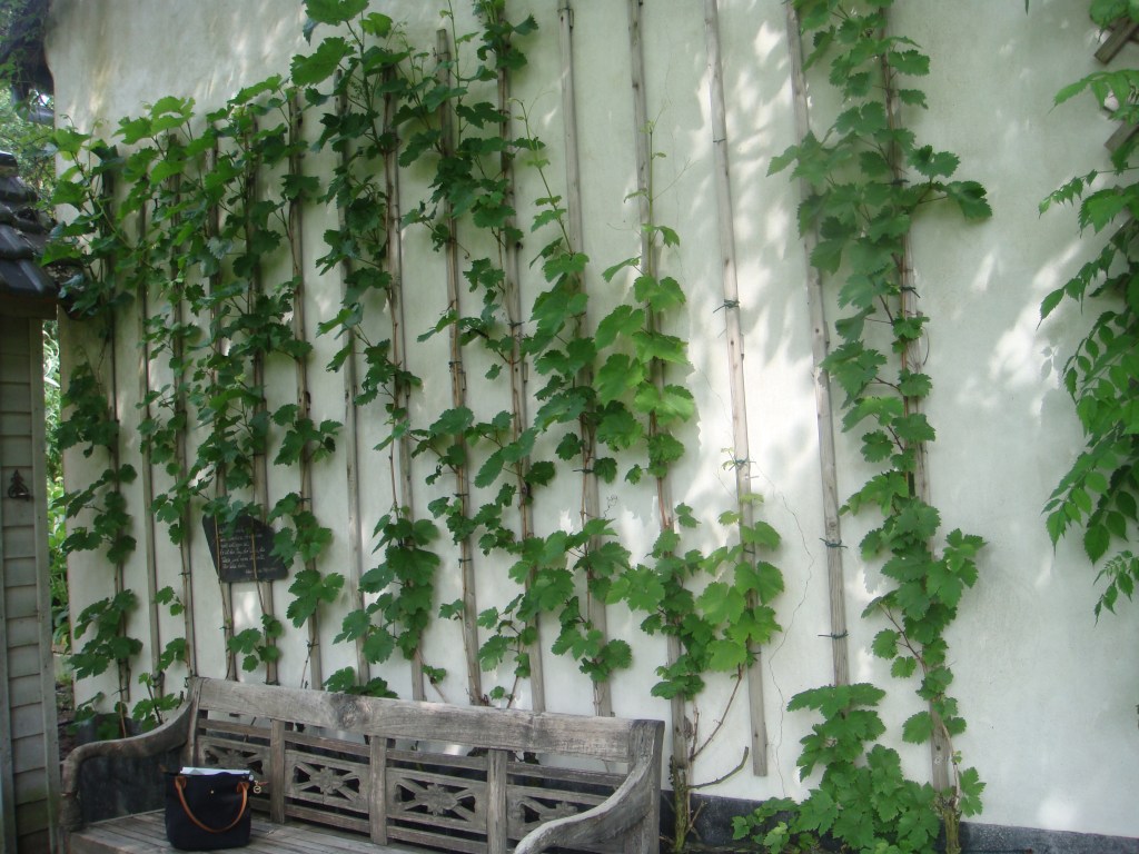 El merendero exterior es más sobrio. Un anfiteatro de césped provisto de altos setos de haya, junto a la parte circular se adosa una empalizada de rosales. Un seto bajo de boj esconde la parte baja de los rosales y establece una forma en el conjunto.