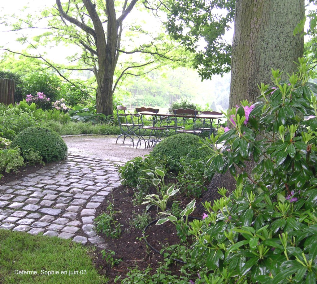 Dina Deferme no practica jamás el “ puntillismo “.Las plantas de sus macizos están siempre agrupadas en grandes macizos y dispuestas en “ “masas oblicuas “ con referencia al camino, tal como preconizaba Gertrude Jekyll, famosa paisajista inglesa.