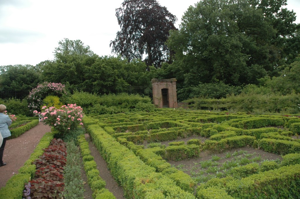 En 1774 había una hilera de casas de pueblo junto al Hekslaan, incluido el presbiterio. Las casas fueron demolidas y la vicaría fue reconstruida al otro lado de la calle. Las obras se completaron alrededor del año 1790. Desde entonces, poco ha cambiado en el diseño de los jardines de servicios públicos. El alto muro de contención en el lado noreste tiene 250 metros de largo y todavía se usa como muro para frutales en espaldera.. Está al pie del muro rabat, el llamado ‘collar’ del jardín. El nivel central lo ocupan los parterres con hortalizas y flores. El nivel más bajo del lado de la calle es como un huerto donde pastan las ovejas. Allí también encontrarás el antiguo pozo que tenía la huerta para abastecer de agua. En la parte noroeste del jardín se encuentran los invernaderos y el jardín. La bodega de verduras del siglo XVIII está escondida detrás de una puerta en un muro de contención, en la parte este del jardín, escondida entre las rosas trepadoras.