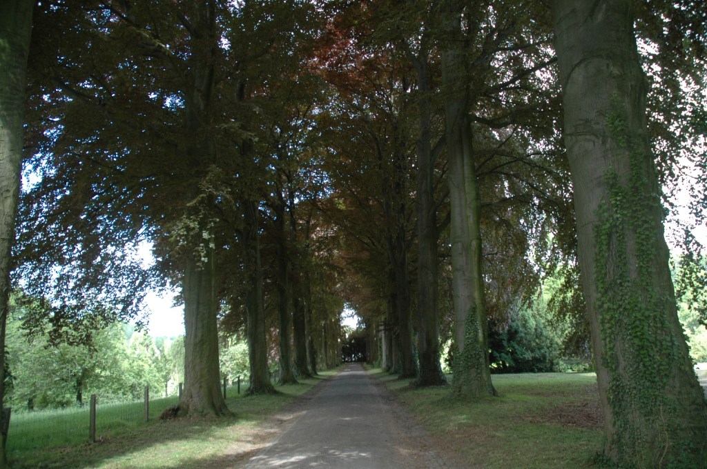Junto al estanque, se levantó un dique en 1890 para la construcción de un camino de acceso desde el Lod. Lavkistraat. Esta entrada escondida entre los tejos es de hecho la entrada oficial al castillo. La avenida rectilínea de haya marrón es el telón de fondo ideal para entrar en el jardín francés. La deriva de plátanos en el lado este de la finca tiene casi dos kilómetros de largo y llega hasta Bommershoven. A la sombra de los plátanos, los expositores y cultivadores de plantas instalan sus tiendas dos veces al año para un acogedor festival.