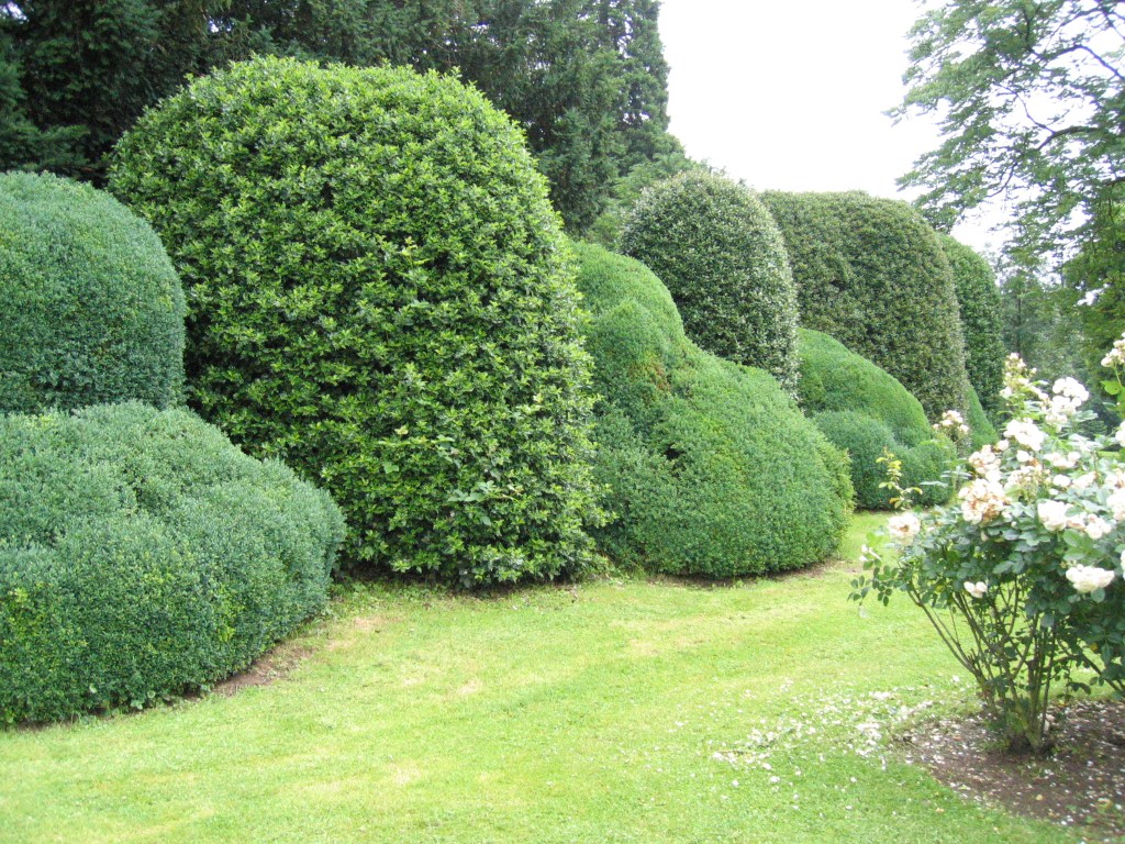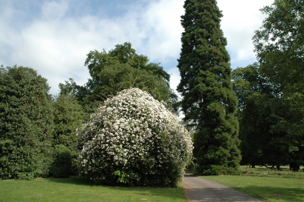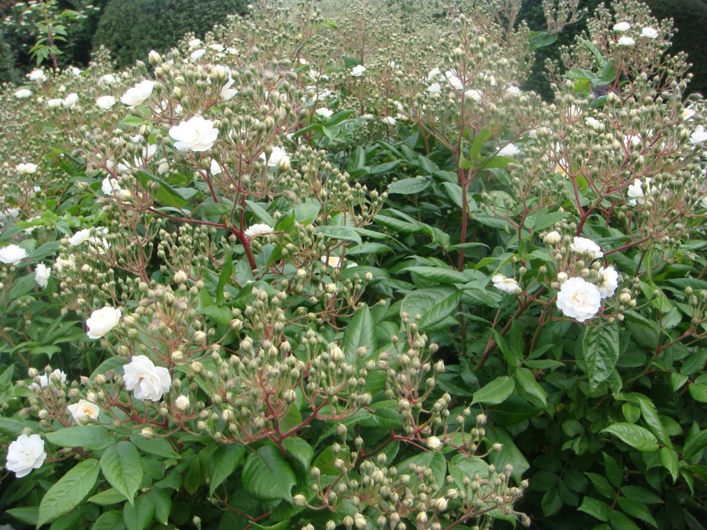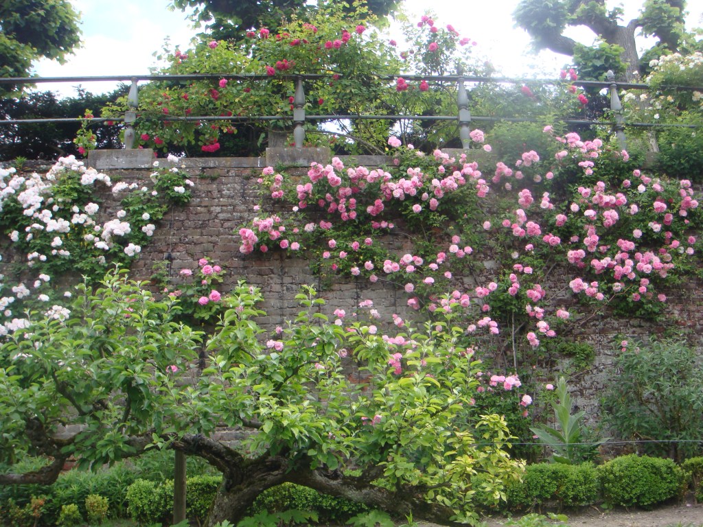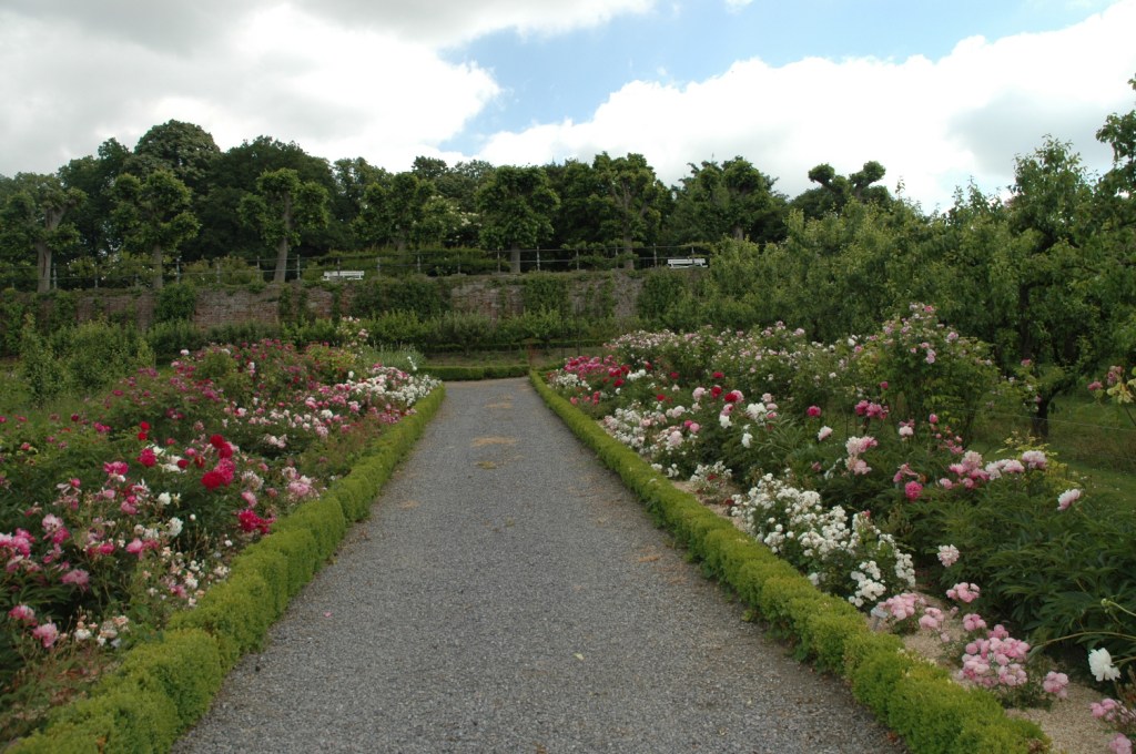 Cerca está la Rosa sericea pteracantha, con sus llamativas espinas aladas, que proviene de Nepal. Rosa Mutabilis se encuentra en la puerta de la bodega de verduras. Más adelante Rosa roxburgii, ambas también importadas de China. Aquí y allá puedes ver trepadoras de origen botánico en las cercas del jardín, contra las paredes o en los árboles: Rosa arvensis, Rosa multiflora, Rosa filipes ‘Kiftsgate’ y el impresionante Paul’s Hymalaian Musk en la parte delantera del castillo. Las variedades botánicas con sus racimos silvestres y su abundante floración casi no tienen rival en encanto y belleza. Pero gracias a la cultura de la rosa durante siglos, su intercambio entre las regiones y los continentes y los numerosos cruces que esto supuso, ahora conocemos una cantidad casi innumerable de rosas en todas las variaciones posibles.