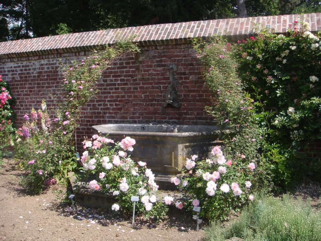 También puede encontrar las rosas del cultivador de rosas inglés David Austin cerca del invernadero. Ha logrado unir lo mejor de dos familias. La vista romántica y el aroma de las viejas rosas Gallicas, Alba’a, Centifolia y Boubon con el carácter de floración continua de los modernos híbridos de té. Louis Lens, un viverista y criador de rosas belga, era un buen amigo de la difunta condesa Nanda d’Ursel. Lens tomó una dirección completamente nueva al cultivar rosas para praderas y jardines públicos. Sus híbridos Moschata se han vendido en todo el mundo. En Hex todavía se pueden encontrar copias de sus experimentos, algunos de los cuales nunca llegaron al comercio, por ejemplo, en la fila al lado de las cuevas. Pero también encontrarás algunas de sus más bellas creaciones en la huerta y en el llamado jardín de amigos junto a las terrazas. La condesa Nanda d’Ursel también tenía debilidad por las pequeñas rosas de la familia Polyantha. Los encontramos en la huerta; en largas filas frente a las peonías y en las camas alrededor de la cuenca.