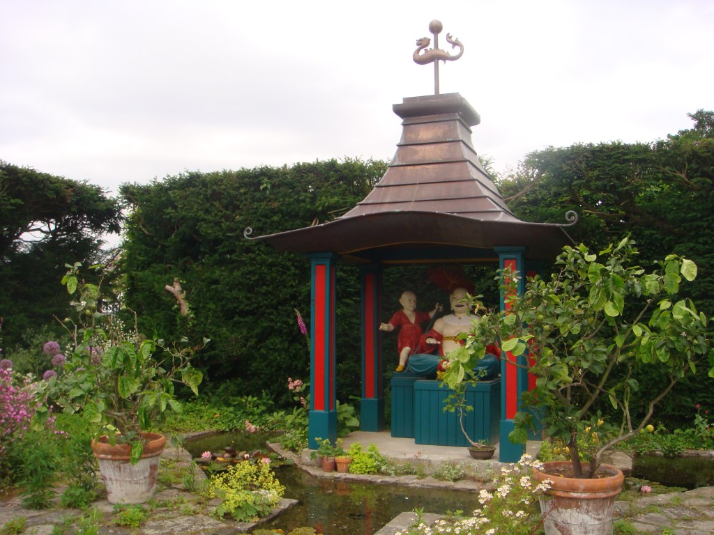 EL JARDÍN CHINO En el jardín chino de van Suzanne’ kan men een eigenaardige chinoiserie admire: un voluminoso Buda sonriente tallado en madera policromada de finales del siglo XVIII. La imagen es de Lieja hecha a ejemplo de una pequeña porcelana que había en el castillo. La imagen es móvil: la cabeza y las manos se mueven por la presión del viento; burlonamente la imagen también saca la lengua. El jardín está dividido en dos por un estrecho canal central de agua. Las losas son un añadido típico del siglo XIX. Después de la renovación de la condesa Stéphanie d’Ursel en 2006, aquí se recolectaron plantas especiales de origen oriental.