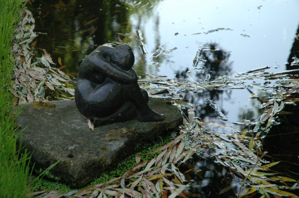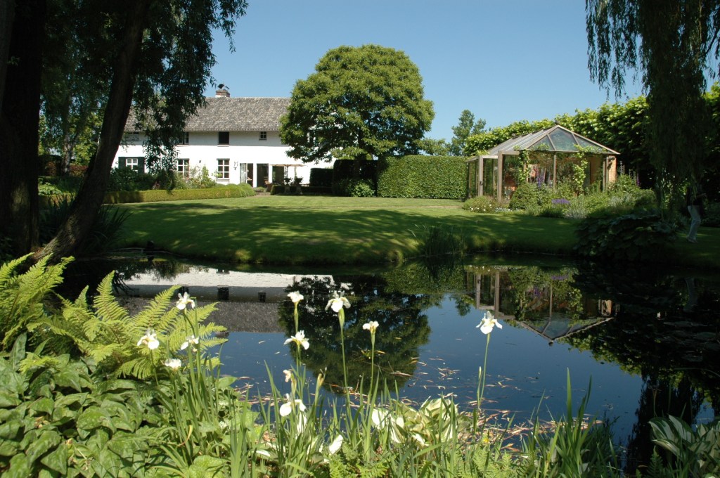 Los setos – haya, boj, tejo – determinan la estructura para limitar la naturaleza, que puede desplegarse a su antojo en toda su exuberancia. Grupos de árboles y un estanque natural le dan al jardín un aire de parque, al igual que el arroyo que bordea la parcela. El edificio está presente en forma de una auténtica panadería (restaurada) y un invernadero.