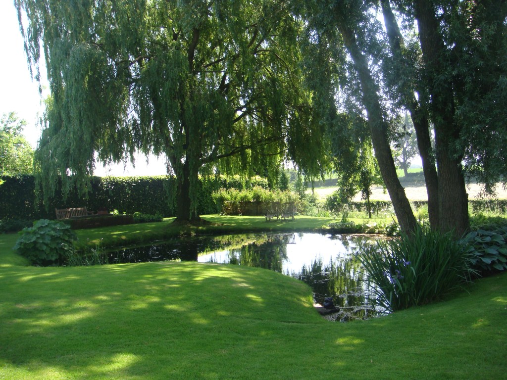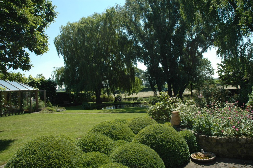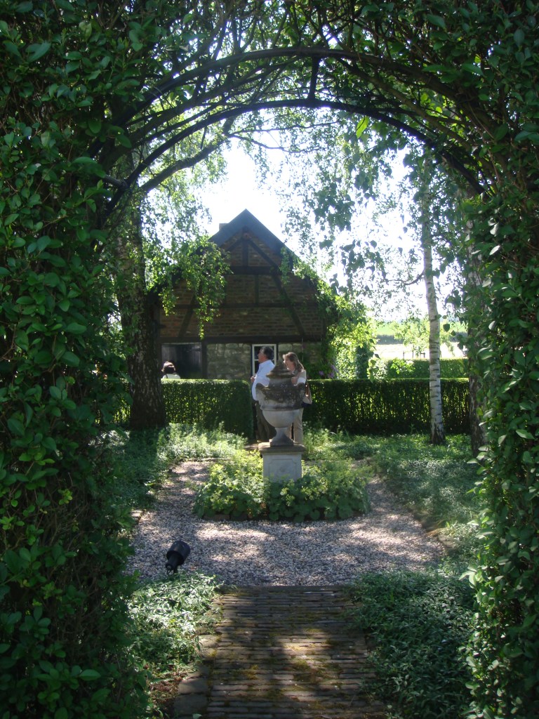 Un pequeño pasillo entre dos setos conduce al jardín principal, que se abre como un abanico con vistas sobre el paisaje circundante hacia las colinas. Esto le da al jardín una sensación casi ilimitado de la profundidad y de la paz. El diseño está dominado por un fuerte cultivo cerca de la casa de campo que le conduce naturalmente al paisaje cerca de las fronteras.