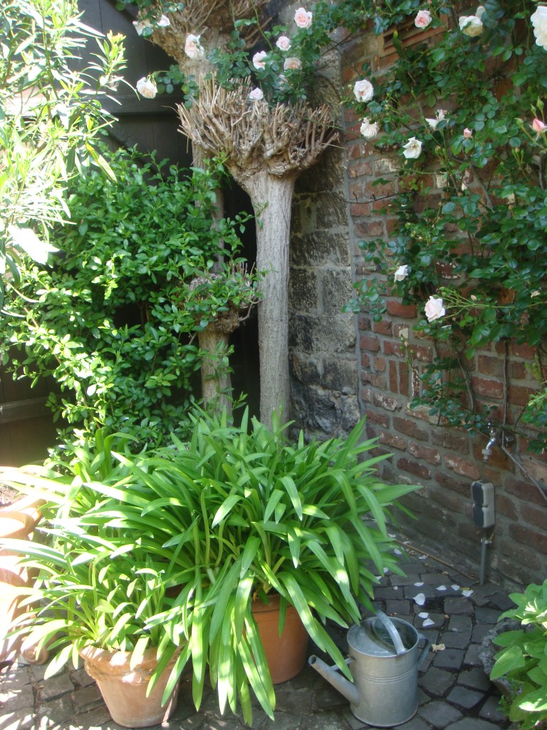 El patio o patio de la finca se utiliza principalmente para grupos de plantas en macetas, amantes de la sombra y amantes del sol, alrededor de un plátano que, junto con una fuente de pared que salpica, crea una especie de atmósfera mediterránea.