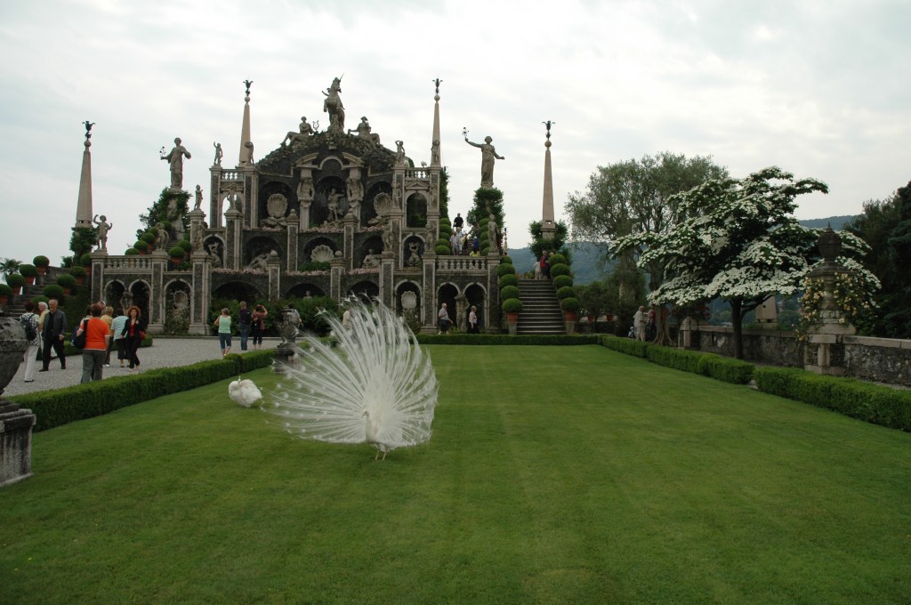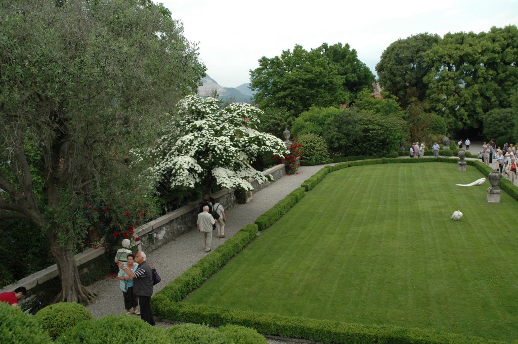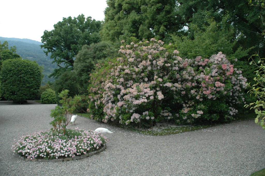 El Parterre de las azaleas encanta durante la floración y el Jardín del Amor es una fiesta para los ojos, formado por setos de boj que crean un bordado verde visible desde lo alto de las terrazas. Camelias, espalderas de rosas en mayo, adelfas en junio, cítricos y hortensias en pleno verano iluminan el jardín italiano de Isola Bella, donde los pavos reales blancos viven en libertad.