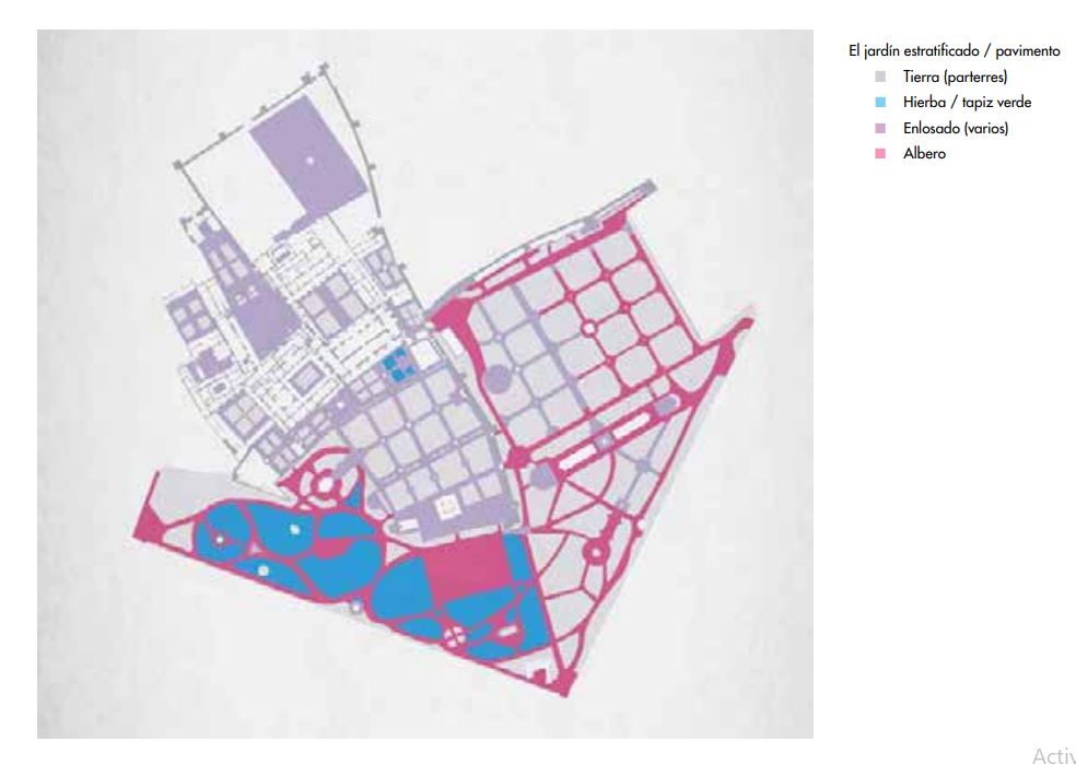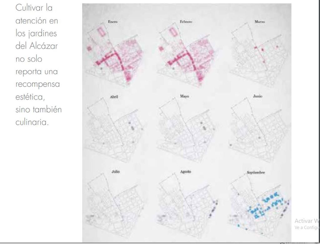 Actualizando— los diferentes jardines potenciales que latentemente perviven en el Real Alcázar y que se relacionan, como ya hemos subrayado, con el cuerpo del visitante, con la cultura que lo acoge o con el ambiente que lo envuelve.