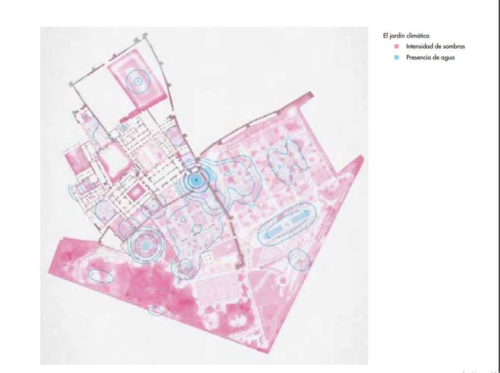 Este mapa se complejizó posteriormente con la localización de las diferentes masas de agua en el Alcázar, recogiendo y celebrando los múltiples usos y dimensiones que el líquido elemento encarna en estos jardines. Nos referimos al agua como canal de riego (acueducto), como superficie refrescante (Sala de la Justicia, Baños de Padilla), como elemento reflectante (Jardín de las Flores), como fuente estética (Sala de la Justicia, Estanque de los Nenúfares o Montaña del Parnaso) o como elemento sonoro (Estanque de Mercurio).
