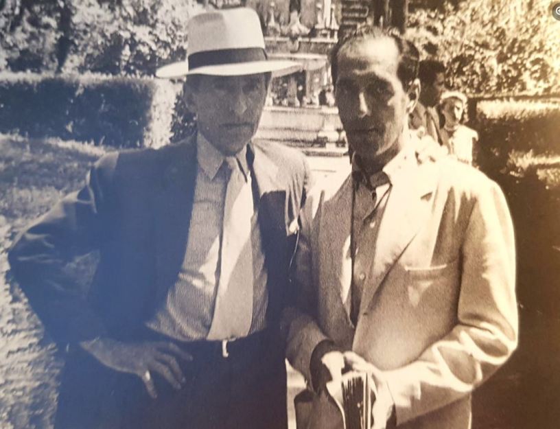 Joaquin Romero Murube y Jean Cocteau en los Jardines de los Reales Alcázares de Sevilla.
