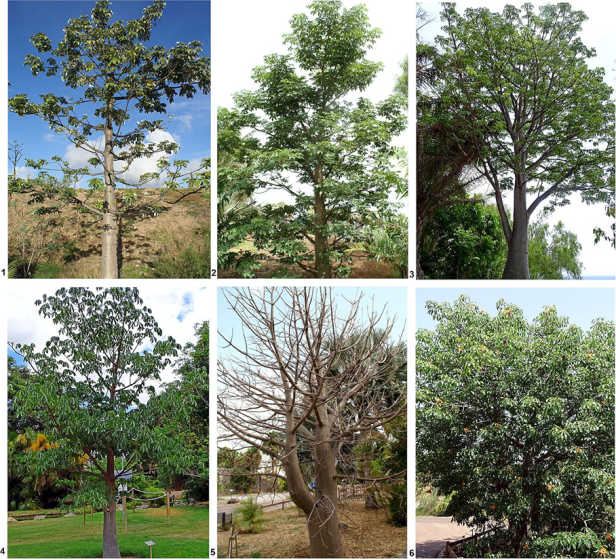 1. A. digitata en Los Cristianos; 2 y 3 dos ejemplares de A. digitata del Palmetum; 4. A. perrieri del Palmetum; 5. A. za en el Palmetum en Mayo y 6. el mismo árbol en Agosto