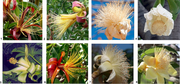Flores del género Adansonia. 1. A. madagascariensis; 2. A. rubrostipa; 3. A. grandidieri; 4. A. digitata;5. A. perrieri; 6. A. za; 7. A. suarezensis; 8. A. gregorii